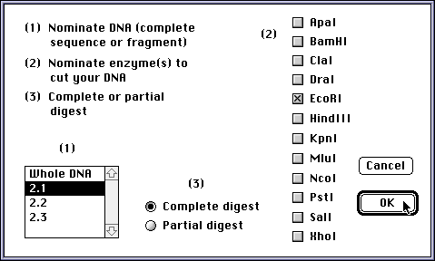 Gelsim - Students are given an unknown gene sequence, either circular or linear, to map. The DNA can be restricted with a range of enzymes, either singly or in pairs, and either completely or partially. Fragments can be cut out from gels and further restricted.