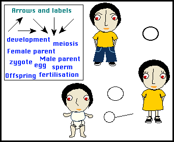 SimpleGene is an introductory program to the Hands On Genetics set. The student has to follow genes from parent to offspring and to put in phenotypes to match. The program starts with a screen diagram of a family, including gametes, which the student has to build into a life cycle diagram. The arrows and labels are supplied to complete the diagram: