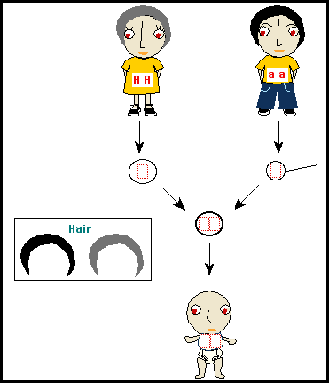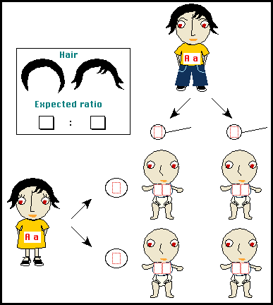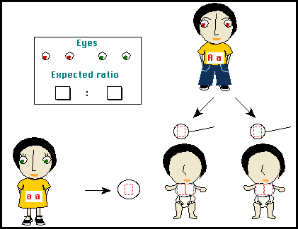 Next, the program introduces genes and characters. Here is one example. The genes have to be inherited from parents to gametes to offspring, after which the appropriate character has to be put into place.